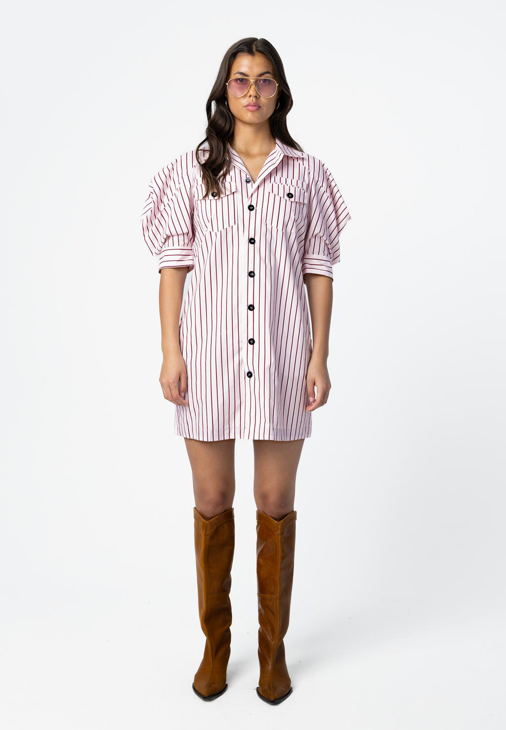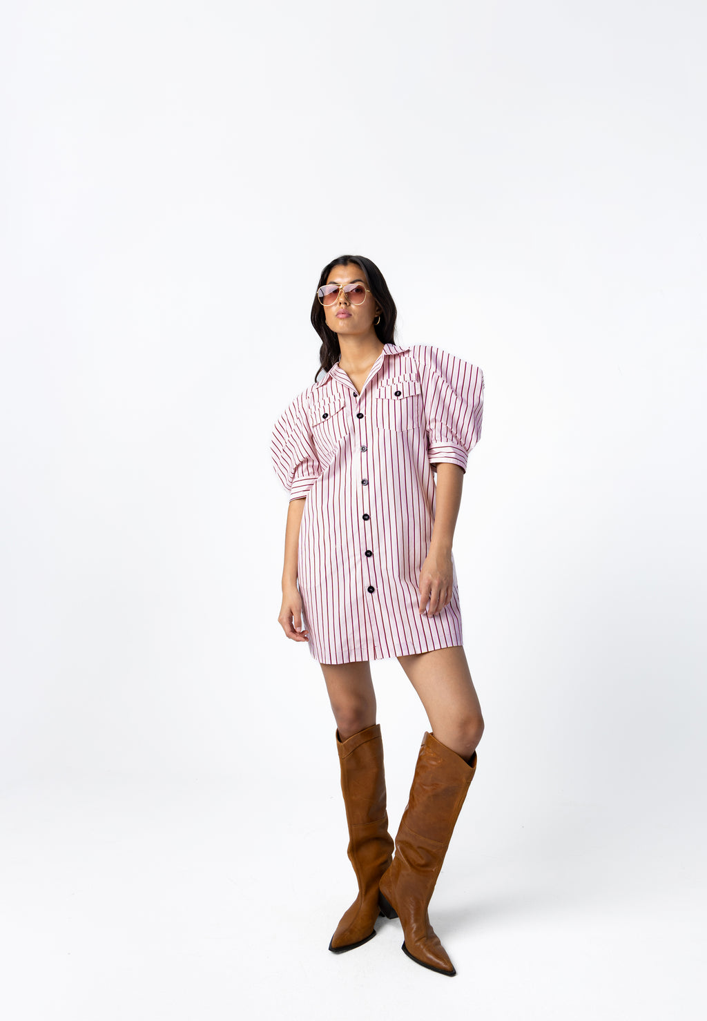 Modellen är 173 cm lång och bär storlek S. Hon mäter 84 cm runt bröstet, 65 cm runt midjan och 96 cm runt höfterna.
