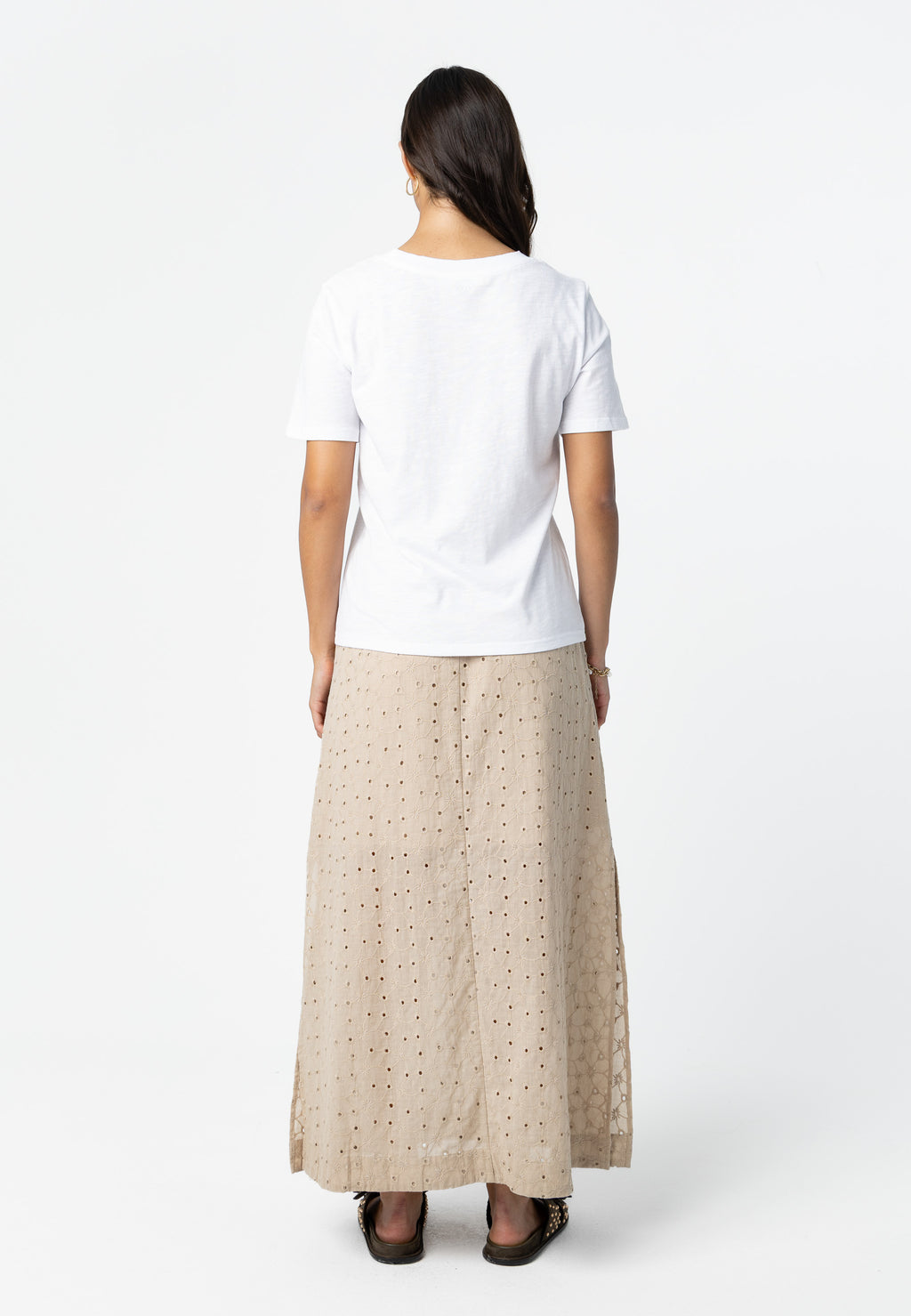 Modellen är 173 cm lång och bär storlek S. Hon mäter 84 cm runt bröstet, 65 cm runt midjan och 96 cm runt höfterna.